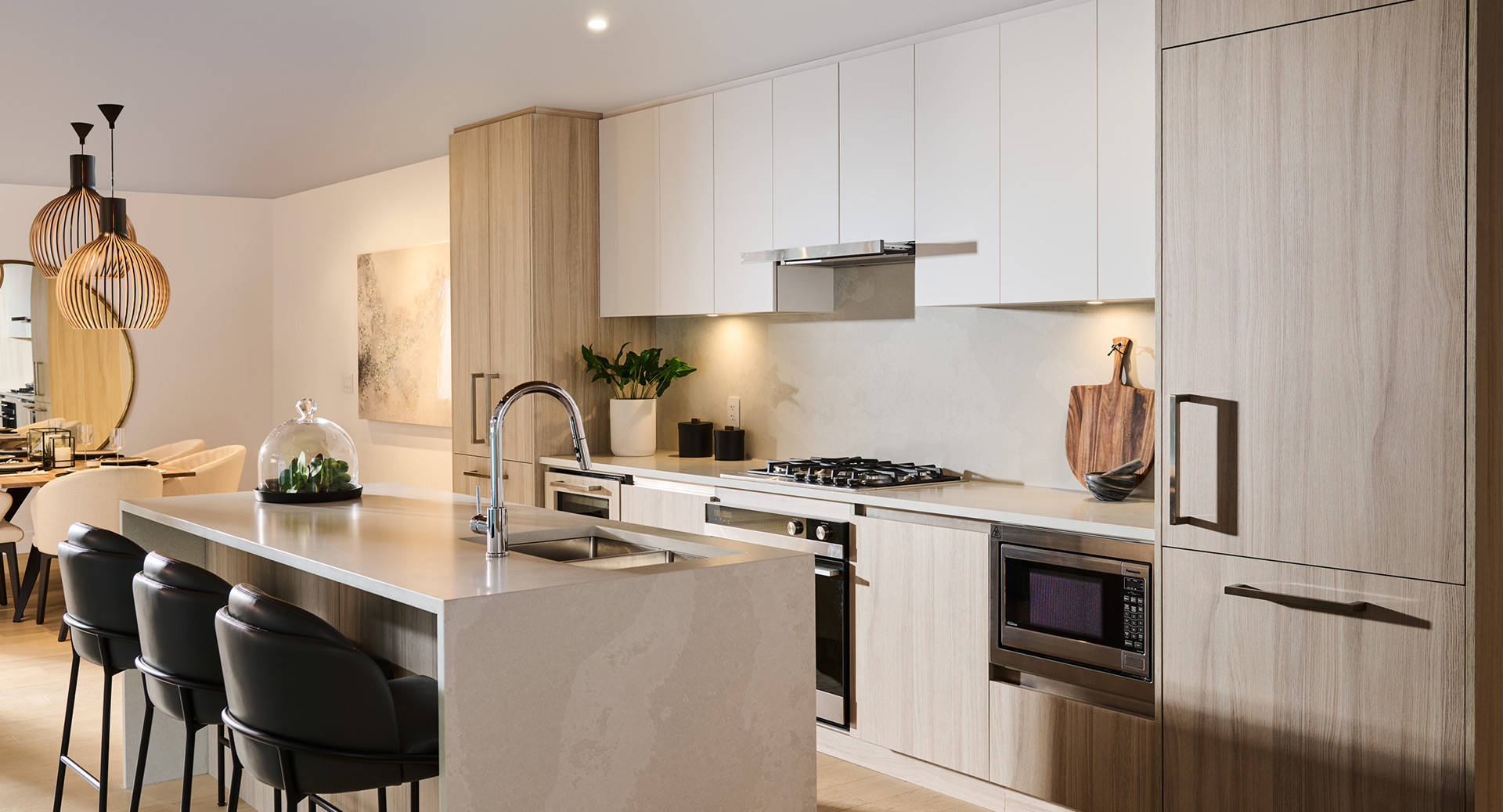 Available in two colour schemes, the kitchen is an unequivocal statement of design. Timeless, modern, and functional, the expansive space is rooted in craftsmanship. Quality cabinetry beautifully contrasts in a combination of textured and matte finishes. Premium quartz countertops cascade from islands in a waterfall effect. And integrated appliances by Fisher & Paykel are superior gourmet tools. Throughout, clever storage solutions ensure food, accessories, and dishware are well organized.